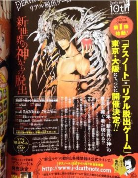 《死亡笔记》10周年纪念 现实逃生游戏曝光 来源: 飞翔小编 2014/2/27 20:12:15 浏览量:534 最新一期日本动漫杂志公布了《死亡笔记》10周年纪念企划第一弹,与现实逃生游戏合作,其主题为逃离新世界的神,游戏背景在"死亡笔记"事件发生10年后,又一名自称"奇拉继任者"的"新奇拉"诞生,参加者作为一名搜查员,要在1小时的限定时间内摆脱由死亡笔记带来的死亡命运,活动将于5月30日至7月27日在东京和大阪举行。