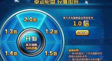 如 果玩家觉得自己转到的倍数不够理想,也可以再次转动幸运轮盘来提升现有充值倍数。每次转动轮盘都只需消耗500点券,每天每个玩家都可以获得最高 100000点券的额外返利,最高2倍的点券充值倍数让你帐号中的Q币瞬间增值,海量的充值返利让你轻松获得“腰缠万贯”的称号。