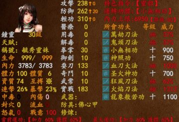 (钟灵作为整个游戏中前期最有用的人,有先手,有灵貂,血刀配合主角,可惜不能练归真,否则就是神级队友了,这次决定一直用到最后。小无作为主体用火焰才有意义,妙手空空需要圣火加集气。虽然龙象弱了,但在拿到易经之前有龙象回内伤还是必要的,我曾想过用吸星化功或者九阳代替易经与龙象,但内伤是影响集气最大的因素,既然这个角色定位是职业小偷,那输出与续航的问题是次要的。)