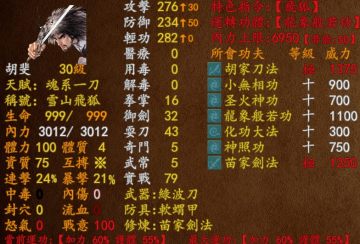 (胡斐龙象归真强悍的姿态已经是过去式,但我觉得阳内的胡斐只能调和后龙象主体,否则也没有别的出路了,难道还搞个高防的胡斐?!哈~!以他低弱的兵器值,拿不起冷月,再往上练刀我也只觉得他浪费格子,而且我不打算把冷月给他,感觉是浪费,换给女主也比他自己拿来得好。上面写的武功基本都是小胡的标配,吸星和狮子是我加上去的,加狮子为了加强已经衰落的杀气,胡刀的消耗也不少,所以练吸星。想不出还能练啥了,就把化功也练上,战斗中吸星、化功随便出哪个都是好的。)