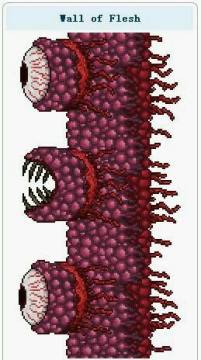 肉山:血肉之墙。将地狱恶魔脚上抓着的向导巫毒娃娃,在地狱(世界最底段)扔到岩浆里,会召唤血肉之墙。击杀后会使世界进入新时代,即肉山后。会刷新怪,新地形,新事件