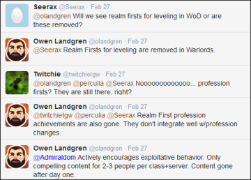 正如之前在5.4开发人员访谈中所提起的那样,新资料片德拉诺之王将不会加入任何等级和专业的服务器第一成就。近日,魔兽世界道具与奖励设计师Oven Landgren再度在推特中肯定了这个消息。