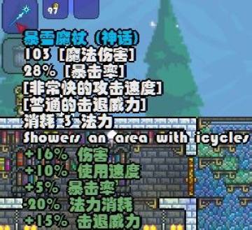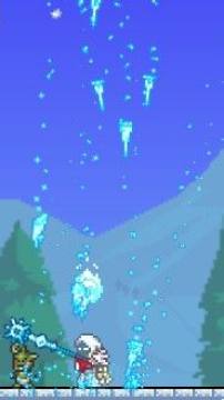 攻击模式是从天上掉下冰锥,一次是三个冰锥,但是一直按着就可以做到几十个冰锥同时掉下来(暴风雪...)伤害并不低的暴雪魔杖的攻击速度极其快速,打一半的boss也就是45秒秒的,也是本人很喜欢的武器之一,1.2.2里面也就是这把武器使法师的较弱单挑能力提升了上去(群攻),法师再一次迎来了春天。