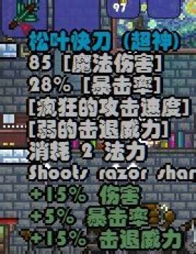 与大鲨鱼进行对比可以看出,松针的大鲨鱼的射速不相上下,而且由于松针是一次射出2-3根松针所以伤害比大鲨鱼高很多,配合法师的幽魂可以达到很有效率的吸血,可以算是一把很厉害的武器了。