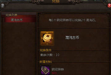 每周有10次机会使用稀有的阴司异铁兑换混沌石,每个阴司异铁可以兑换2个混沌石。