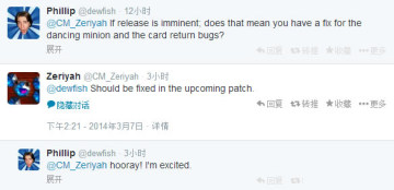 要说眼看着炉石传说传说就要正式发布了,现有的各种坑爹BUG还不搞定那怎么行?近日从炉石传说社区经理Zeriyah处传来了好消息:困扰大家N久的诸如卡牌互换位置等BUG将于下个补丁统统修复完毕!
