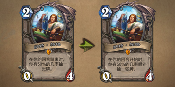 纳特•帕格现在将在你的回合开始时尝试为你抽牌,而不是在回合结束时。作为一张在游戏早期就能打出的牌,纳特的抽牌能力过于强大了,导致他成为了许多套牌的必选随从。这一改动将适当削弱他的抽牌能力,给与玩家更多的机会在他开始抽牌之前找到对付他的方法。