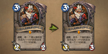 工匠大师欧沃斯巴克 现在是一个3/3的随从(由2/2上调),效果改为:战吼:使另一个随机随从变形成为一个5/5的恐龙或一个1/1的松鼠。