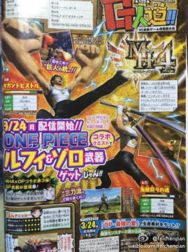根据最新一期日本游戏杂志的情报显示,Capcom狩猎游戏《怪物猎人4》将于2014年3月24日配信最新海贼王合作任务,猎人们完成该任务就可以制作获得路飞和索隆的武器,其中巨人之铳对应双剑类型,索隆的武士刀对应太刀类型,各位《怪物猎人4》玩家不要错过了。