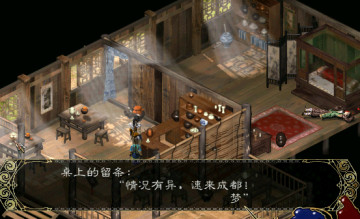 当然,也可能是五色教大批杀手袭击了茶馆,接应封玉书,杀死龚楷并掳走了张氏兄妹——不太符合实际。首先,茶馆内部并没有恶战后的痕迹,而且以张氏兄妹的武功,就算面对五色教大批高手,对方肯定会有人手损失,但茶馆内的尸体和血迹只有龚楷一个人的。如图: