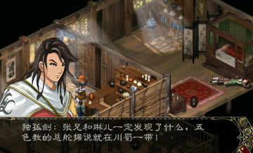 顺便一提这段剧情是我最喜欢的一段新剑剧情,实在是太精彩了!!!!成都,这个看似热闹的城市,气氛却诡异凝重,步步杀机,仿佛有一双眼睛在盯着你,另玩家不寒而栗。客栈神秘的掌柜和小二也是不正常,蠢蠢欲动的五色教杀手们个个阴险毒辣。独孤剑和杨瑛二人在明,与在暗处的五色教杀手斗志斗勇,相互连续恶战数场,在恰到好处的音乐渲染下,游戏呈现出一种神秘而紧张的气氛,真是令人大呼过瘾,畅快淋漓!!!!!这段剧情使我对新剑的爱达到了顶峰,如此到位的气氛渲染,实在的令人叹为观止。好,回归正题。