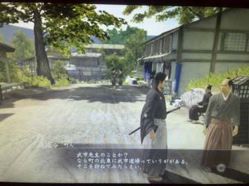 一段剧情后回到龙马的老家,阔别了多年,自然要多转转,右边的老头与其对话可以玩劈柴的小游戏,之后走到街市上发生剧情,龙马挺身而出帮助了被两个土佐上士欺负的一对母女