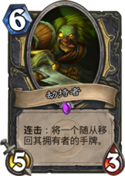 劫持者,潜行者专用随从卡,6法力值消耗5攻击力5生命值,当满足连击条件时,选择一张随从卡,让他回到其主人手上。潜行者有许多的连击卡,想要触发连击,你需要在打出这张牌之前先使用一张其他的卡牌,那么这张卡牌就会被触发连击效果。已经触发连击效果的卡牌同样可以继续作为另外连击卡牌的前置。也就是说只要你打出任意一张卡牌,那么你在本回合内之后所有打出的卡牌都已经触发连击效果。而劫掠者的连击技能,有两种主要的用法,一是消灭对方高费召唤的随从让其回到对手手中,一是让自己需要回到手中的卡牌回到手中。
