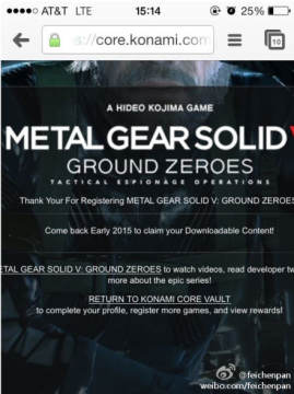 众所周知《合金装备5原爆点》只属于《合金装备5幻痛》的序章,不过购买了原爆点序章的玩家可以在Konami官网进行注册,获得日后发售的幻痛DLC内容,根据国外reddit论坛一位玩家的反映,其在官网注册后提示他可在2015年初获得额外的DLC,这暗示了《合金装备5幻痛》极有可能在2015年内发售上市。