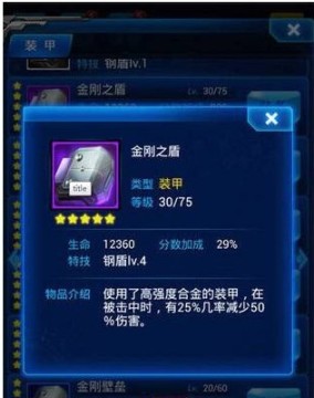 5.金刚之盾:技能是钢盾,使用了高强度合金的装甲,在被击中时,有25%几率减少50%伤害(技能LV4时效果)。