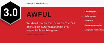 《杀出重围 陨落》原先是手机移动平台的游戏作品,现今Square Enix将其移植到PC平台,国外著名评测媒体IGN最近对该作进行了一番详细评测,最后只给予其3.0分的超低评价,认为《杀出重围 陨落》PC版是原本很受尊敬手机游戏的糟糕移植作品。
