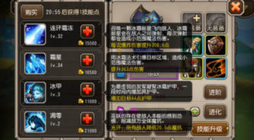 1技能:特色技连环霜冻,每升一级伤害+9,召唤一刻冰球缓慢撞向前排目标,接触到目标会发生爆炸并弹向下一随机目标,弹三次,合集爆破4次,每下都是小范围伤害,威力不减。不得不说,这技能十分叼,面板虽然伤害稍低,但是能够引发4次的AOE,威力是相当巨大的。