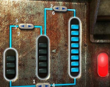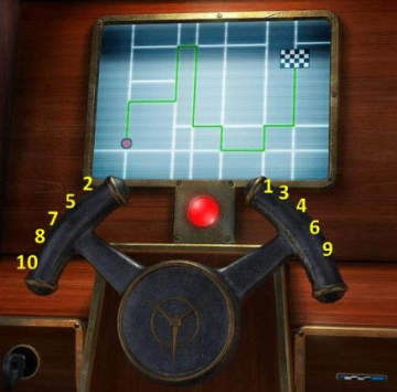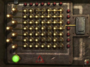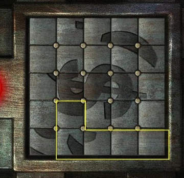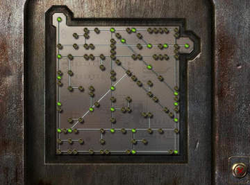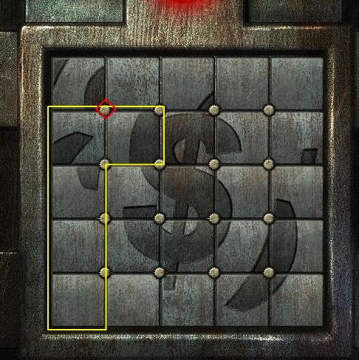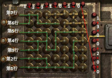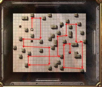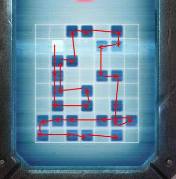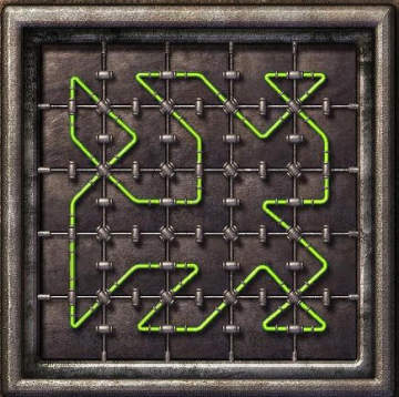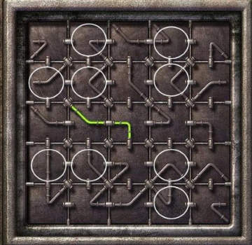 很经典的全接水管游戏,游戏的目的是把所有水管接成一个环路,不像我们在地下室碰到的电路拼接锁,这里的每个拼板都必须用到,并且所有组件必须构成环路,听起来很难,其实因为没有什么变化,只要按着水管的走势走就可以了(系统已经帮你拼好了两块,不要擅自移动这两段水管)