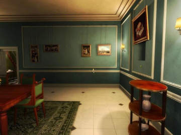 调查小圆矮桌上的日记,仍然一头雾水,离开,继续走向右边开着的门