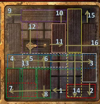 这个游戏的目的就是把钥匙所在的滑块滑出来,并且水平的滑块只能水平移动,垂直的滑块只能垂直移动(用那个小圆磁铁来移动滑块),下面是详细分析: