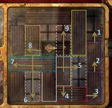 第七步:这样淡橙色矩形内的滑块必须下移一个,钥匙所在的滑块必然要右移一个。
