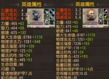 .......对比三星小黑&三星骨弓的成长,可发现小黑的智力和力量较高,骨弓敏捷较高,但是从实际攻防各方面的数据对比(LV67),可发现他们的血量、攻击、防御、都几乎平手,暴击方面骨弓依靠紫技能能增加不少暴击,而小黑在闪避和吸血等级上又比骨弓有优势,在基本能力上算是打成平手,各有千秋,不存在完虐情况(天生1星英雄不比天生3星英雄差)。