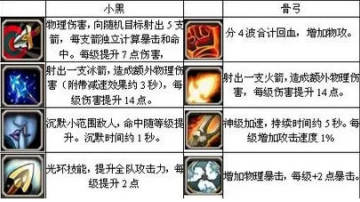 .......小黑:输出技能主要有冰箭和箭雨,一个辅助技能沉默,一个神技物攻光环(全队增加攻击)。小黑的冰箭和骨弓火箭伤害成长是一样的,但是有减速效果(骨弓跪求燃烧效果………~~o(>_<)o ~~),在自身光环作用下,能有不俗的输出,3技能小范围沉默,这游戏机制是当对手发动攻击的时候被打断,那么动作即算结束,如果打中正在发招的对手身上那是相当屌的。最后大招箭雨,非常水的技能,对随机目标射出5箭,每箭独立计算命中和暴击,依托敏捷系高暴击才能发挥点点作用,即使全暴击也不能造成成吨的伤害……小黑攻击顺序:平A→冰箭→平A→沉默→平A→冰箭,中规中矩。