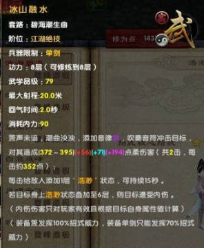 2.冰山融水:远程招式,20米远程追杀补刀叠浩淼用的。这里的浩淼状态,叠了6层,会有内伤buff,跪下吐血,完全不能自我控制4秒,短时间内继续6层,效果递减。