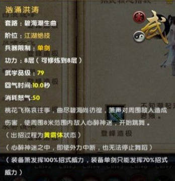 7.汹涌洪涛:大招,骑马舞,很搞笑的招式。伤害不怎么高。让人一度认为碧海是废的套路,原因如此。但是这个是很厉害控制技能是九阴至今为止唯一一个突破群招只能伤害10个目标的限制。但是这个招式只目标在8米以内不管多少目标都会统统跳舞。