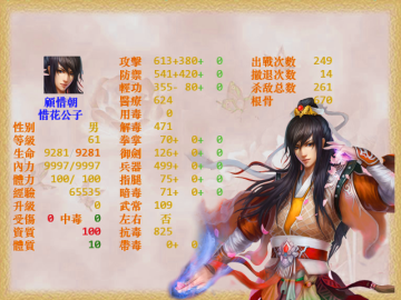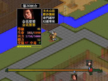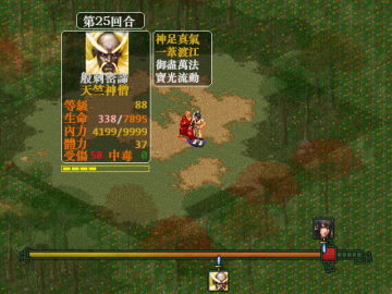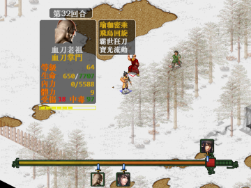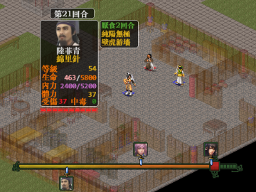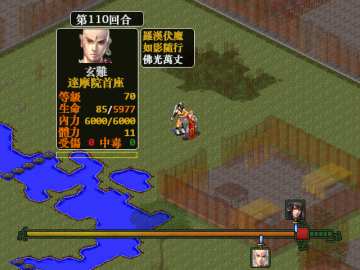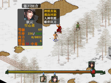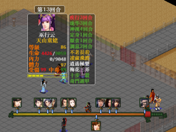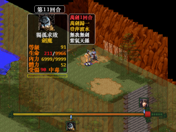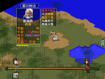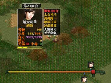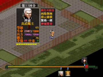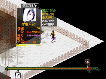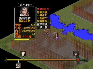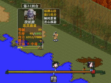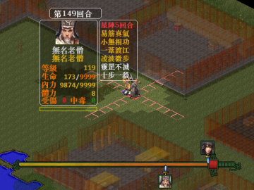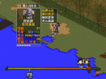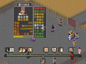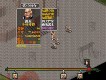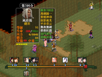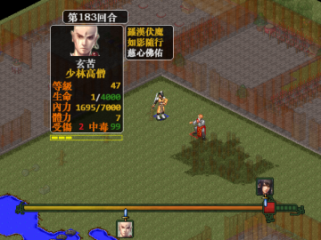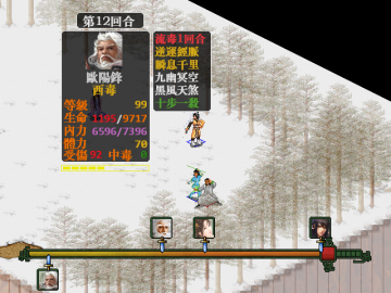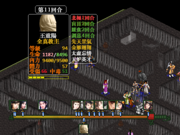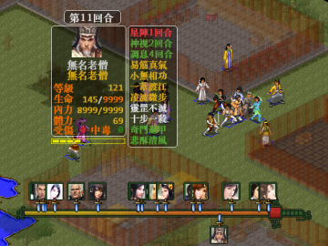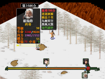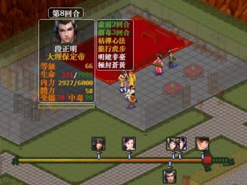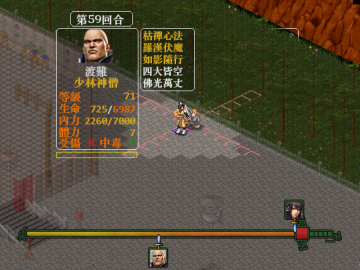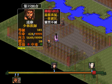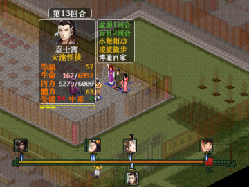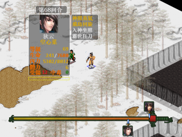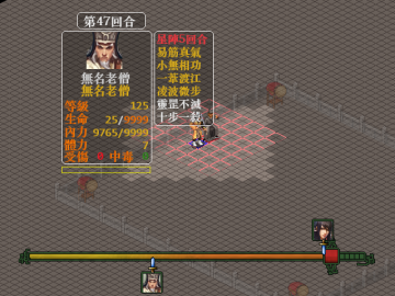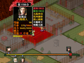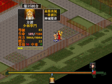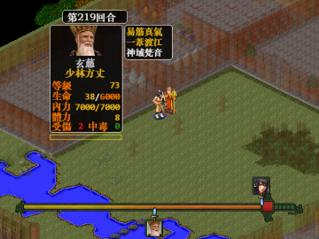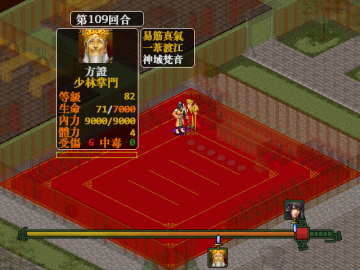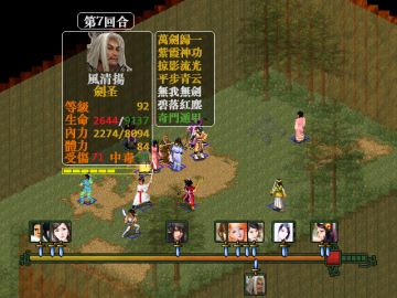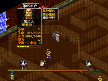 6,险险过了少林三战,S/L了7、8次,一、二战简单,方证无非就是耗,攻击一般,左盟主攻击很强但命中不高也不经打。第三战的任我行向问天都太脆了,主角飘忽走位吸引火力,好容易才打成左冷禅和冲虚半血重伤的局