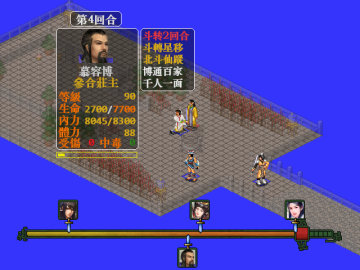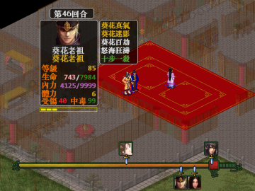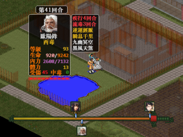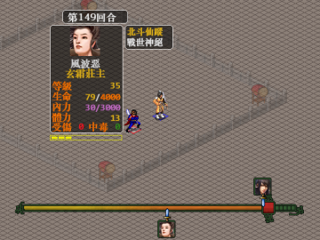 第二战南四奇3回合就被送走,让戚芳顶老祖,主角顶狄云,没想到戚芳不能吃药瞬满还是不行,被老祖双暴送走,这时狄云和老祖还有半血。几乎绝望,最危险时是1000红血当回合斗转没了,就是吃九转回复4500血45伤,赌狄云和老祖都不双爆,时主角硬是连吃5个回合九转顶住了,到5000血把斗转重新开上,继续吃牛黄黑玉反击死他们。狄云第二条命把毒清了,主角也没法给他上毒,但他体力不回复,还是容易打的。