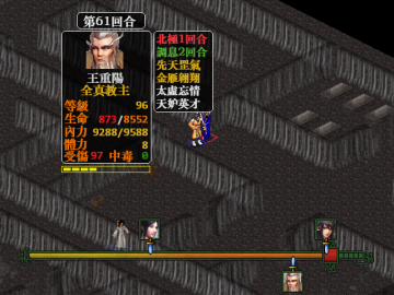 然后开混元功把王重阳耗到100内伤,小龙女远远跑开提供阵法,第15格练先天功