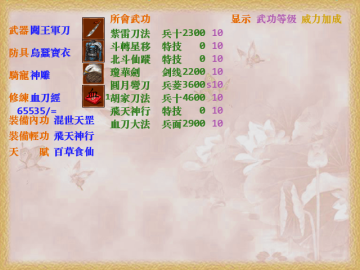 试了不用卡位光吃药死都过不去林朝英,每回合几乎3连击,没了体力还能广寒两连击,实在顶不住。索性去拿齐兵器系的+6武功,过鹿鼎剧情拿百胜刀,平西王府青青最后一次出手2万两扔死鸠摩智。