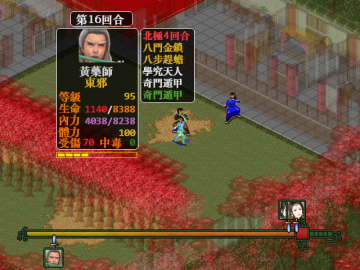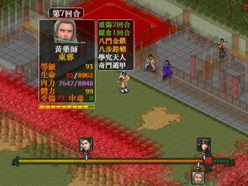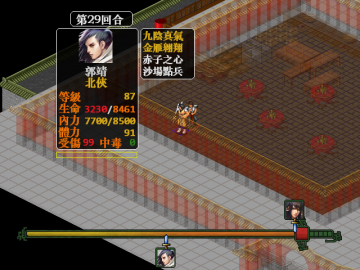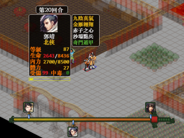 当然,不赌运气的打法也有,2周目打时主角练了七伤佛光寒冰四象10格武功去的,行动比郭靖快,上手就打伤老邪,然后再是郭靖的降龙,一次就过了。