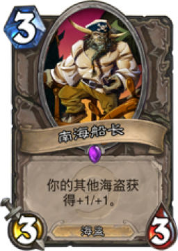 两张卡牌,南海船长,3水晶消耗3攻击3生命,在场时其他海盗属性增强1/1。南海船工,1水晶消耗2攻击1生命,当你英雄装备有武器时,南海船工获得冲锋技能。加上其他几张海盗卡牌,可以组成炉石传说中比较少见的海盗流,配合英雄武器,相互叠加效果光环。但是海盗流前期都难以发挥,需要中期才能爆发,不是十分容易操作,更推荐战士、圣骑或盗贼使用。