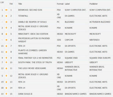 《恶名昭彰 次子》成功卫冕英国游戏销量排行榜冠军 来源: 飞翔小编feichenpan 2014/4/1 10:45:22 浏览量:293 根据最新一期英国游戏销量排行榜显示,索尼PS4独占游戏《恶名昭彰 次子》卫冕成功,微软XBOX ONE主机游戏《泰坦陨落》紧随其后,暴雪PC游戏《暗黑破坏神3夺魂之镰》获得第三名,分列第四第五位的为PS4游戏《合金装备5原爆点》和《我的世界》XBOX360版。英国游戏销量排行榜一览:
