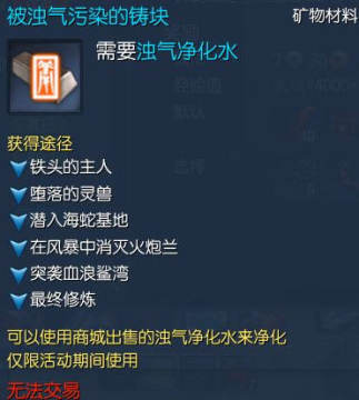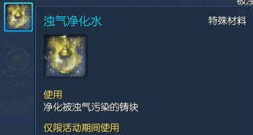 用浊气净化水净化被浊气污染的铸块可得到兑换金币的道具,据说可开出1-10金。