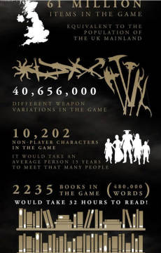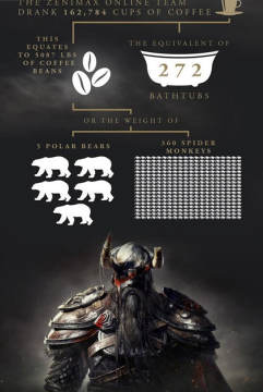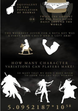美式网游大作《上古卷轴OL》以幽默有趣的图片统计形式告诉了大家这款游戏十分畅销,在该作beta内测阶段共有超过500万名玩家申请注册,玩家通过模型编辑器自定义创建的角色数量可达5.0952187*10的58次方个。