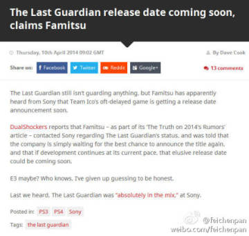 索尼SCEJ工作室的跳票神作当属《最后的守护者(The Last Guardian)》,该作自从2009年公布以来就跳票不断,原计划2011年底发售,结果被延期到2012年内,其制作人上田文人的离开又让游戏发售抹上一层阴影。如今根据国外游戏网站VG247的报道,《最后的守护者》将在2014年E3电玩展上正式公布发售日。