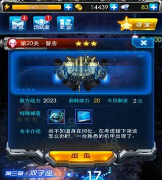 在这两种关卡中,第一章节到第二章节的黄色关卡掉落的大敌机残骸经验为2656,红色关卡掉落的Boss残骸经验为4816。第三章节到第四章节的黄色关卡掉落的残骸经验为3324,红色关卡掉落的残骸经验为6024。以此类推,每往上打两章节,所掉落的残骸经验都会有所提高。每个关卡点进去,都会显示会掉落的物品,点击掉落物品都会看到具体属性,每个经验模块都有它的级别LV,所以优先选择攻打最高级别的红色和黄色关卡,每次关卡一定要打出三星过关,不然有很可能没有掉率经验模块或者一个经验模块,快过关时候看下得分,感觉得分不够果断返回放弃关卡重新打。