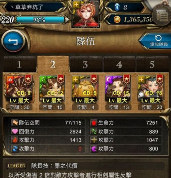 队伍组合推荐以上组合,蜘蛛大树队必备,蝴蝶遇到高攻1CD的BOSS有奇效!BOSS打你一下你反弹一次自己也回满血了!水妖精在这队伍没啥意义,火妖精满CD8和大树只能配合个组合技能,当然你觉得自己不会断心大可以最基本的大树+女王+3妖精组光水妖精,这样可以达到8倍回复伤害!4女妖就是4倍X女王BUFF2倍,但是这种队伍断心就玩完!女王buff很容易断!另外有人说干嘛带史莱姆,三围那么低,双子多好!别闹了,双子也就HP多点,还吃不到加成,300+的回复,另外妖精队干嘛要HP,血少容易回,溢出也多!攻击?妖精队是靠回复伤害的好吗?史莱姆在加成下多了700+回复!各项都完爆双子!