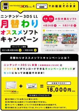 任天堂3DSLL掌机最新优惠活动 赠送游戏兑换券 来源: 飞翔小编 2014/4/14 20:40:00 浏览量:704 任天堂最近公布3DSLL日版掌机的最新优惠活动,只要玩家在2014年4月26日后购买以下任意一款型号3DSLL主机,将免费获赠一张游戏兑换券,该券可从每月指定的3DS游戏中选一款下载,游戏为每月更换,比如4月26日至5月31日的是《来吧 动物之森》和《妖怪手表》,此后任天堂还未公布,活动到9月30日为止,兑换券可送人,可在活动内任意时间兑换,但是3DS主机不在活动范围内,敬请注意。