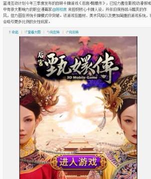 后宫经典神剧《甄嬛传》即将制作成为卡牌游戏,蓝港CEO兼董事长王峰已经在微博中说明今年三季度将会发布卡牌游戏《后宫•甄嬛传》,该游戏将会突破传统卡牌游戏系统模式,会吸引更多年轻女性粉丝。
