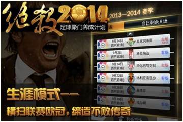 在《绝杀2014》中,有着最专业的足球数据。游戏庞大的数据库涵盖了近千名球星,除了现役球员外,“忧郁王子”巴乔、“万人迷”贝克汉姆等众多已退役的经典球星将以巅峰状态回归绿茵场!不仅如此,《绝杀2014》中的联赛赛程表完全按照英超、西甲、德甲与法甲的真实赛程表设计,国内杯赛、欧冠、超级杯等赛事也同样真实,带给玩家完美的游戏代入感。