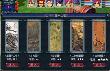 《宫苑图》,《游春图》,《江帆楼阁图》,《洛神赋图》需要玩家5人组队共同进入。每幅图画的深处,都藏着一个画中的瘴气。玩家需要找到引路仙人,并根据他的指示最终找到画中瘴气。沿途之中有妖怪埋伏在引路仙人附近,玩家必须打败他们。