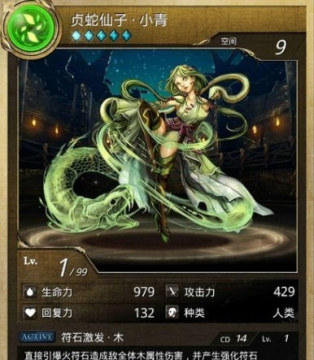 小青是木属性队伍,效果是消除对应符文进行伤害。从这点可以看出小青的暴力是毋容置疑,搭配队伍木队可以让她的暴力更加显著,而且还能打酱油一起纯属性队伍。