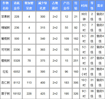 如图栗子树可以增加228的繁荣度,195的金币和326的经验,位列收益之冠。与此同时种植的需求也最高,18152的金币和官府5级。