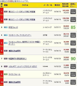 《第三次超级机器人大战Z时狱篇》称霸游戏销量排行榜 来源: 飞翔小编 2014/4/17 16:11:29 浏览量:668 根据上周2014年4月7日至4月13日的日本游戏销量排行榜,机战系列最新作品《第三次超级机器人大战Z时狱篇》的PS3和PSV版游戏分列冠亚军,实在是可喜可贺;获得第三名的是3DS掌机游戏《妖怪手表》,第四和第五名也是3DS游戏,其分别为《马里奥聚会》和《蜡笔小新 呼风唤雨春日部电影明星》。最新一期日本游戏销量排行榜前十位: