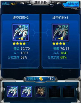 在闯关模式可以获得升级装备的材料,双数关可以获得进阶装备的材料,装备要在升到等级上限时才能进阶,这个在完成新手教程时应该大家都知道。每件4星的装备(蓝色)要同样的一件4星装备才能进阶成4星+1,4星+1后要有同样的两件4星装备才能进阶成4星+2,依此类推一直到4星+3后可能进阶5星(紫色),五星后进阶方法也跟4星的类似这里就不罗嗦了,一直可以进阶到5星+3,也就是90级。