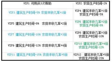 vip1只需要充值6元就可以购买,且有vip1专属礼包。玩家升级vip2就需要50元了,唉,平民级玩家也就只能默默的看着土豪快速的升级自己的小镇了。玩家的vip等级达到12级,那么建筑丰收几率可以提高5倍,农作物的时间收成时间缩短15%,效果还是蛮不错的,有了这个特权,玩家就能快速的获得金币,来升级自己的小镇了。